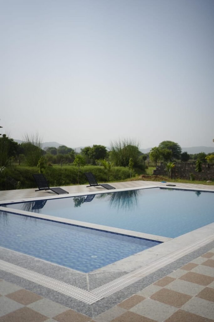 Its relaxed open‑air setting makes it a family‑friendly spot to unwind, with children welcome and easy access from free on‑site parking. Located in Khilchipur within a short drive of Ranthambore National Park, the pool becomes a serene base to recharge between morning and afternoon safaris.